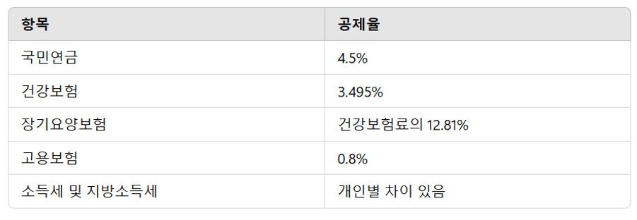 이 항목들을 모두 적용하면, 일반적으로 약 9~10% 정도가 공제됩니다.